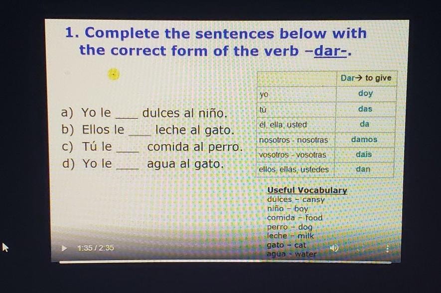 le c) Tú le d) Yo le dulces al niño. leche al gato. comida al perro. agua al gato. nosotros nosotras damos vosotros - vosotras ellos, ellas, ustedes dan Useful Vocabulary dulces - cansy niño - boy comida food dog leche - milk gato - cat agua-- Water