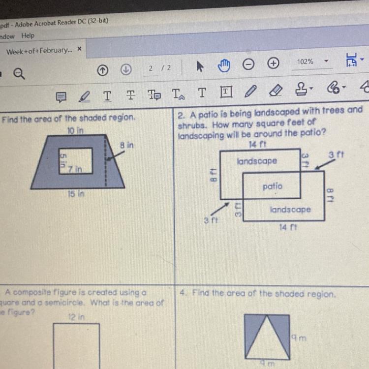 2. Find the area of both landscaping rectangles, including the patio bit.