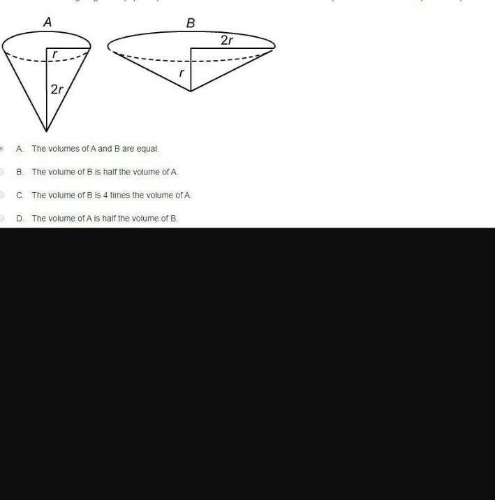 Volume of A = (1/3)(π × r^2 × 2r)