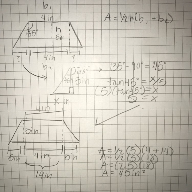 I'm not sure what level of math you are at, so I hope it's alright that I used the trig function of tangent. Basically, you just have to find the second base to be able to find the area using the formula for the area of a trapezoid (A = ½h(b₁ + b₂)). To do this, use the information given and a little creativity to create a triangle and find the missing pieces. Finally, plug everything into the equation and voilà. Hope that helps!