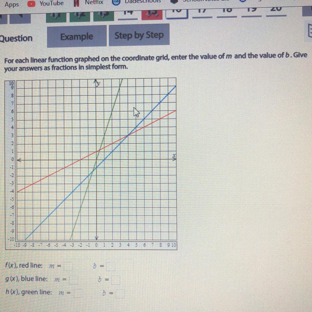 <u>Blue Line</u>: This is pretty much the same as the red line, see the slope it's rise once and run once so, the slope is 1/1 which is 1. Then the y-intecept is b which is when x is 0, we check the y-axis line and we see that the y-intercept is -1. m = 1, b = -1