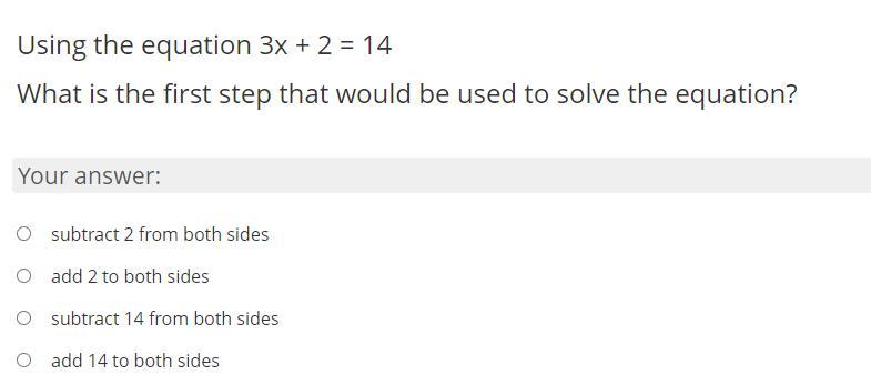 Since we want constants only on the right hand side , we have to remove 2 which is on the left hand side. The opposite of +2 is -2 and whatever we do to one side , we must do to the other side. So, The first step that would be used to solve the equation should be Subtract 2from both sides.