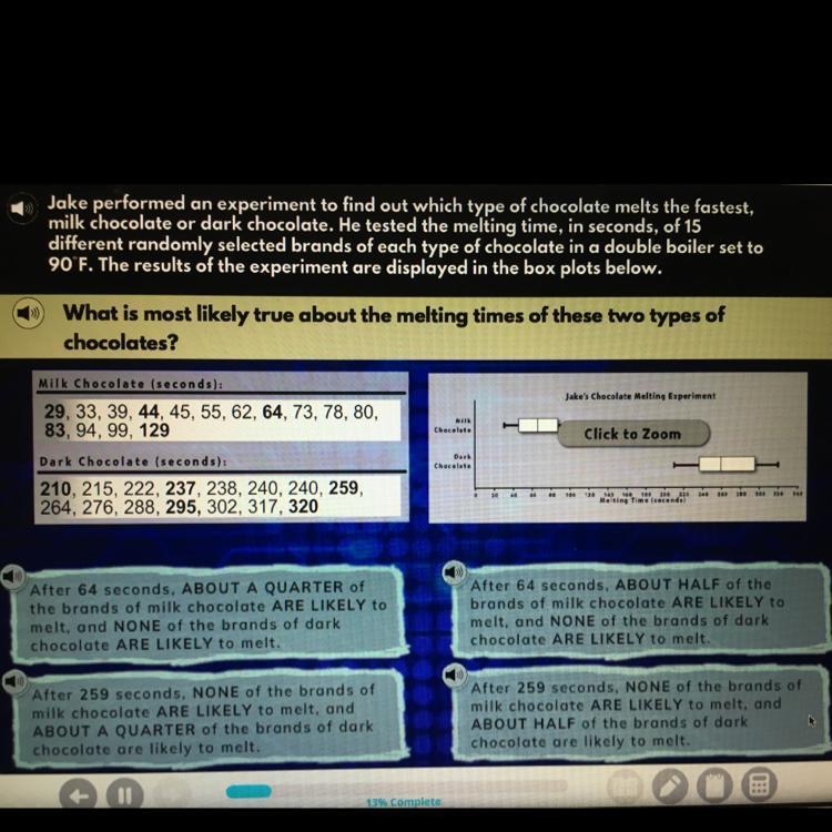 - Third and Fourth are incorrect because we can see from the box plot diagram, highest melting point of milk chocolate brands is less than the lowest melting point of dark chocolate brands. So, ALL brands of dark chocolate will be melted by then.