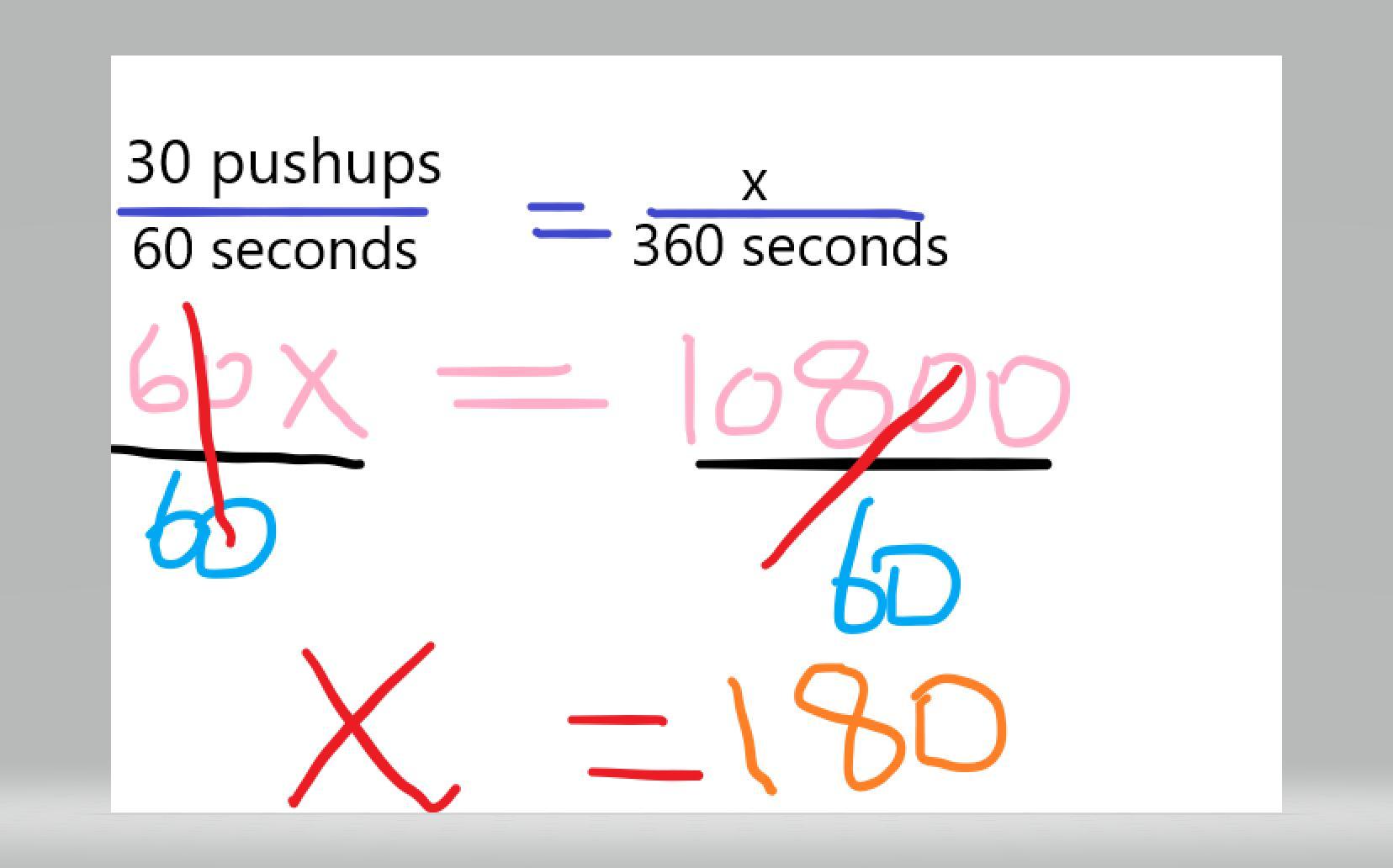 Step-by-step explanation: First set up a proportion. The proportion would be 30 pushups over 60 seconds equal x over 360 seconds. Then you would cross multiply which is 60 times x which is 60x .After that do 30 times 360 which is 10,800.Now you have 60x = 10,800.NOw divide both sides by 60 which gives you 180 as x.