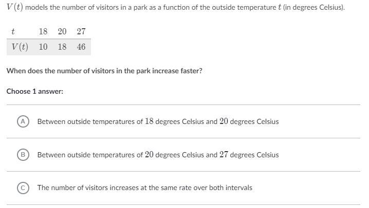 We are asked to compare the rates at which the number of visitors increases over the interval between an outside temperature of 181818 degrees Celsius and 202020 degrees Celsius, and over the interval between an outside temperature of 202020 degrees Celsius and 272727 degrees Celsius. These correspond to the domain intervals [18,20][18,20]open bracket, 18, comma, 20, close bracket and [20,27][20,27]open bracket, 20, comma, 27, close bracket.