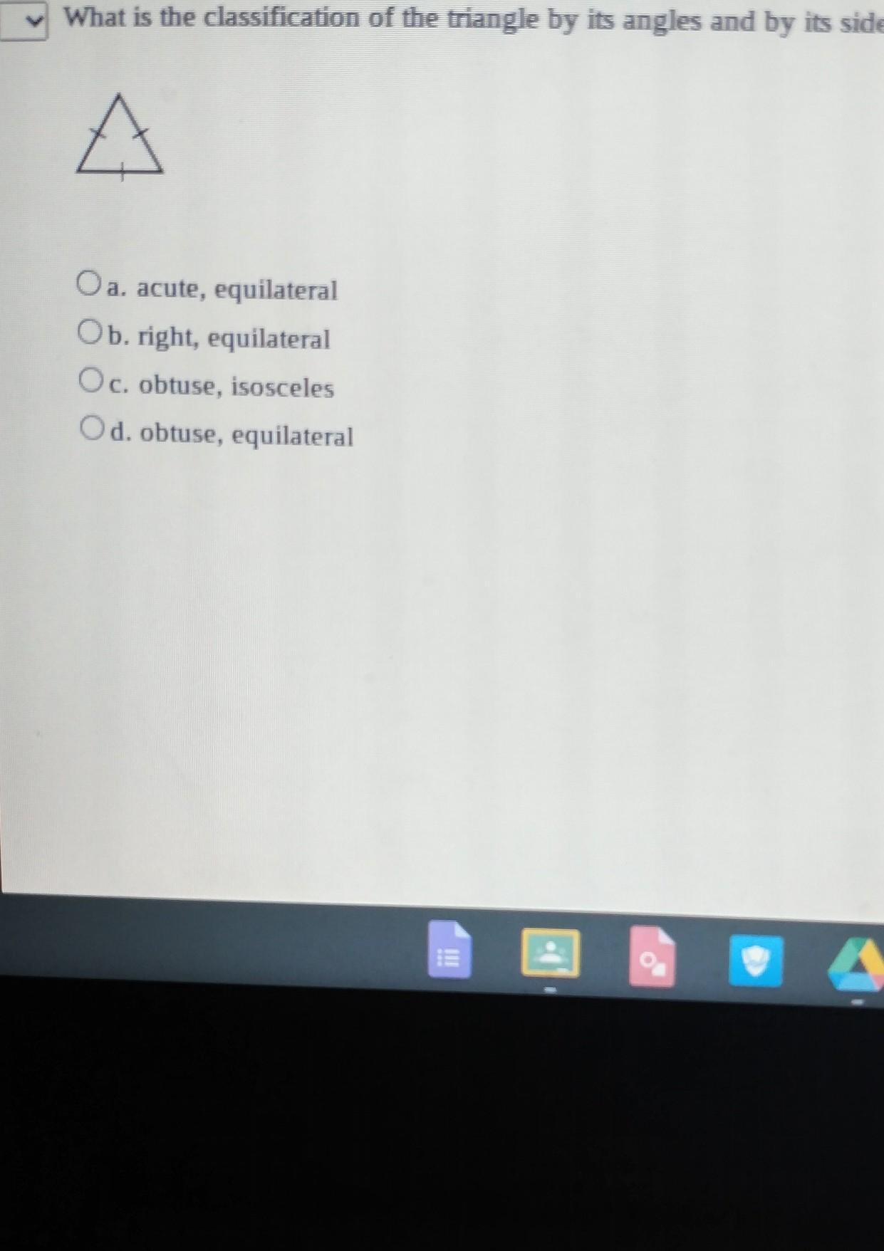 From the picture the lines on the triangle mean that the sides are equivalent to one another so from that you can eliminate option c. There are not right angles within the triangle so you can eliminate option b. The angles are less than 90 degrees as they arent even cloe to being a right angle so they arent obtuse so you can eliminate option d. Now you are only left with option a.