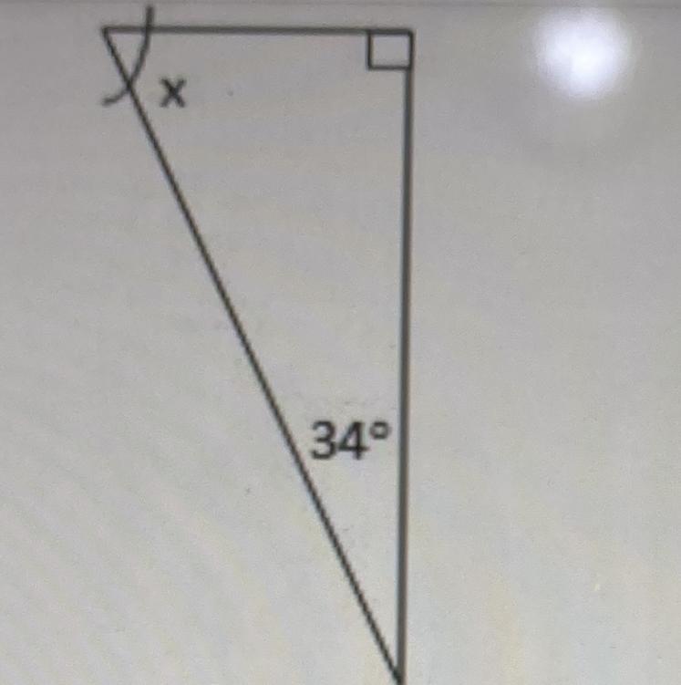looking at the triangle you can identify it as a right triangle by the square at the top right corner. all right triangles have at least one 90 degree angle, which is what that square marks. the question also gives you the measurement of the second angle wich is 34 degrees. all angles of a triangle have to add up to 180 degrees, so we can add 90 degrees and 34 degrees wich gives us the sum of 124. now if you subtract 124 from 180 you get 56, therefore, the angle x is 56 degrees.