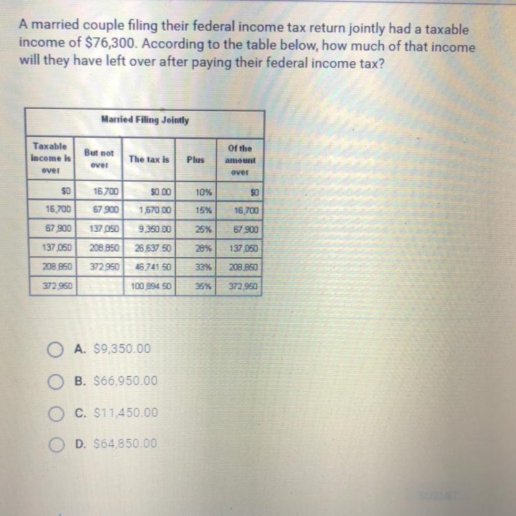 The income will they have left over after paying their federal income tax is <u>$64,850.00</u>.