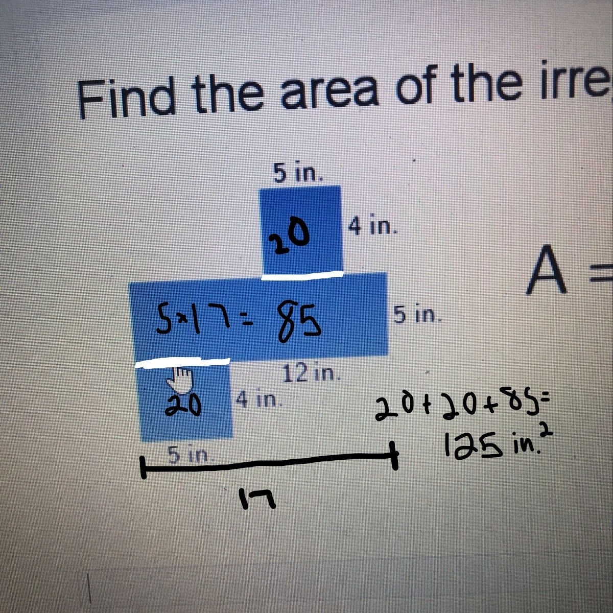 Okay so when finding the area of an irregular figure, you break it up into regular shapes(like the square, rectangles, etc). Here you could separate this figure into a rectangle and two squares. After finding the area of these shapes, you add them up to get the total area of the figure.
