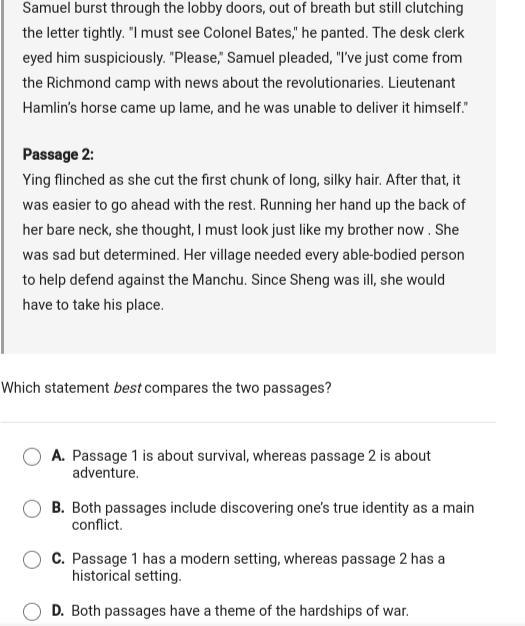 In the second passage, it says, "Her village needed every able-bodied person to help defend against the Manchu." This person is obvisouly in a position of defense and how this girl is going to protect her village as her brother. Usually when protecting something, it's in a fight. Also, she said she "flinched" when she cut her first chunk of hair off, meaning it was causing her distress and wasn't easy.