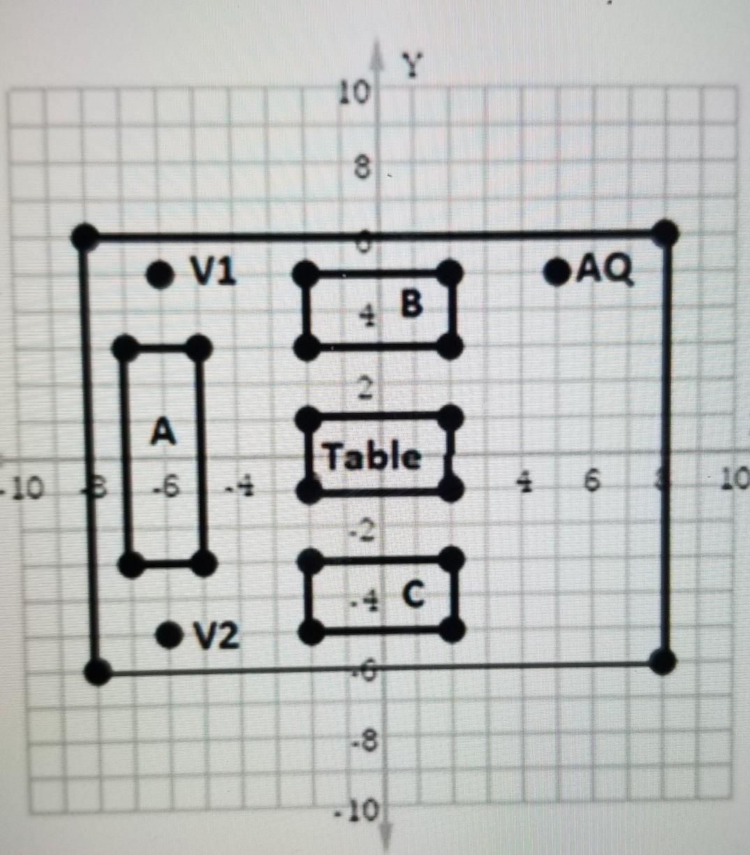 Kate is arranging new furniture in her rectangular sitting room. She has mapped the arrangement on a coordinate pane. A, B, and
