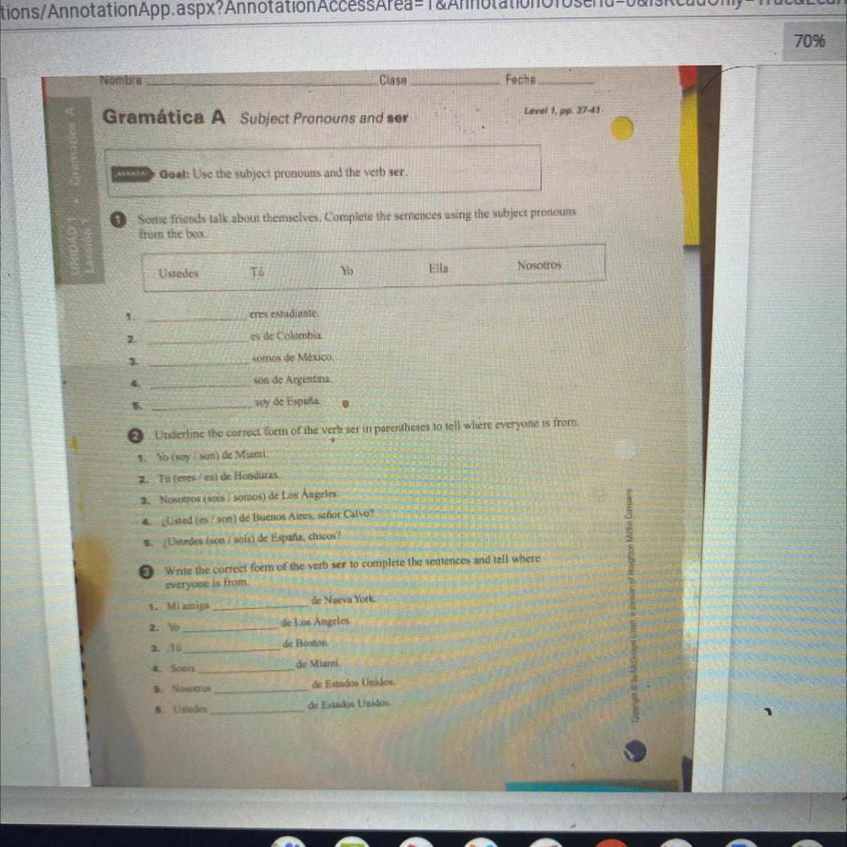 <em>Regresé a la cabaña (hut) que</em> -<u>ESTÁ UBICADA</u>- <em>se ubicada al norte de la ciudad. Necesitamos una habitación que no</em> -<u>SEA</u>- <em>muy cara. Busco un hotel</em> -<u>CON</u>-(que) servicio de habitación. <em>Conocemos a alguien que siempre</em> -<u>VIAJA</u>- <em>con brújula. No tengo amigos</em> -<u>DE</u>- (que) <em>tantos lugares exóticos como tú. Completar Completa el siguiente diálogo entre dos viajeras y el recepcionista de un hotel con el indicativo o el subjuntivo de los verbos en paréntesis. Sigue el modelo. Modelo Luisa, conozco a alguien en ese hotel que nos</em> -<u>PUEDE</u>-____ <em>(poder) ayudar. Luisa, conozco a alguien en ese hotel que nos puede ayudar. Question 6 with 5 blanks LUISA ¿Tú tienes contactos aquí? Porque yo no conozco a nadie que nos (poder) </em>-<u>PUEDA</u>- <em>asistir en una situación así: sin alojamiento ni dinero. ISABEL No, y definitivamente necesitamos a alguien que (hablar)</em> -<u>HABLE</u>- <em>español y que nos (prestar)</em> -<u>PRESTE</u>- <em>un poco de dinero. LUISA Tengo una idea. Busquemos a un empleado que (llamarse)</em> -<u>SE LLAMA</u>- <em>Mauricio Santos. Es un pariente de mi marido que (trabajar)</em> -<u>TRABAJA</u>- <em>en este hotel desde hace diez años. Tal vez él nos podría ayudar.</em>