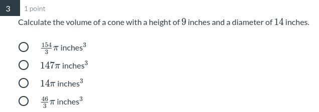Step-by-step explanation: The formula to find the cone’s volume is r^2 x height x pi x 1/3