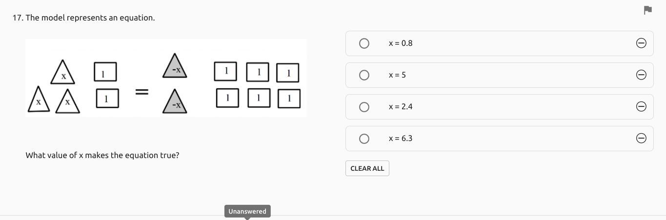 The equation in simple terms is 3x+2=-2x+6. This is because there are 3 triangles with x in them and 2 squares with 1 in them on the left side, and 2 triangles with -x on the right side with 6 1's. If you don't know how to solve this I'd be happy to go in full depth: subtract 2 from 6, subtract -2x from 3x this will give you 5x=4 and then you divide 5 from for giving you 4/5 or 0.8.