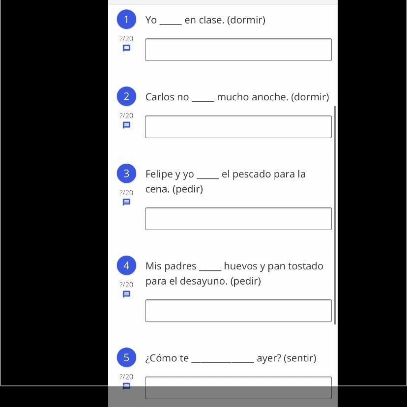 Salio, vuelve, van, ven, ven, comprenden, comrendes, comprendo, aprendi, salimos, perdimos, vuelven, volvemos