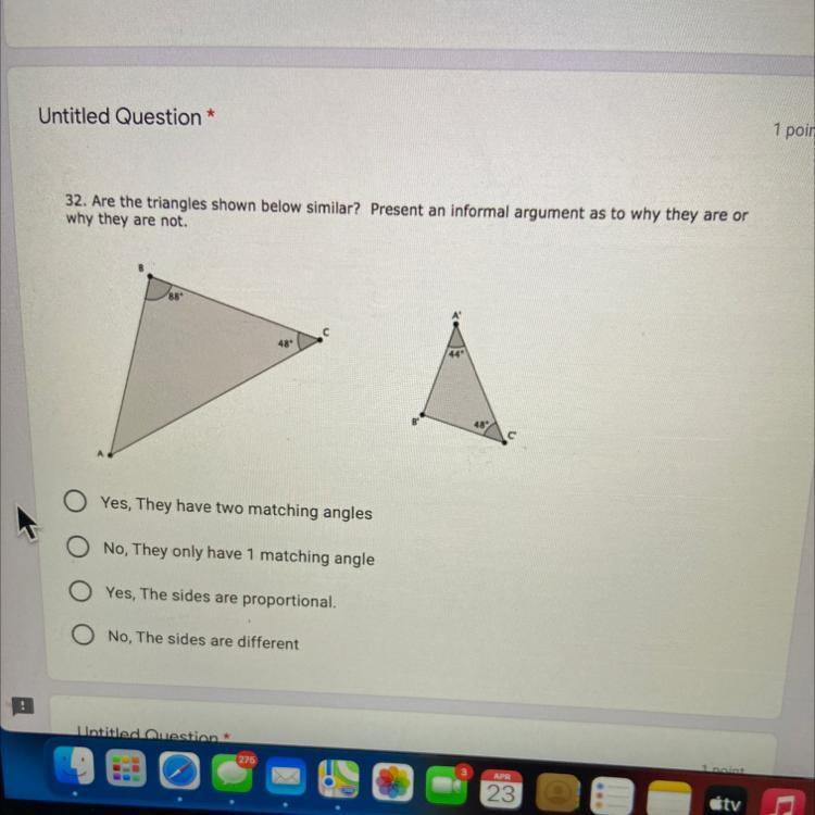 Are the triangles shown below similar? Present an informal argument as to why they are or