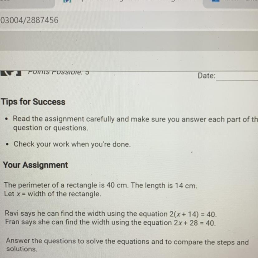 Her equation of 2x + 28 = 40 is Ravi's after distributing 2.