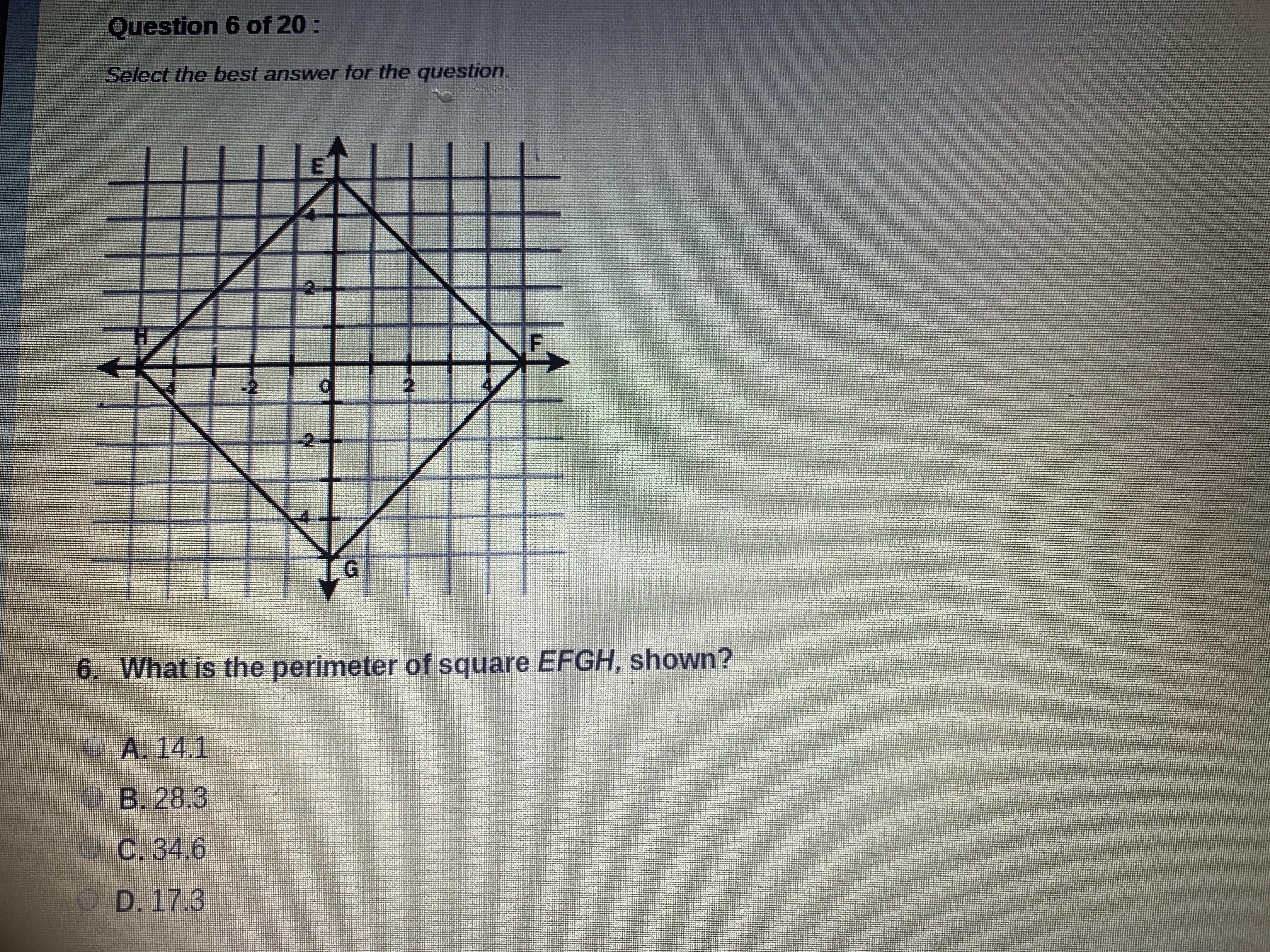 What is the perimeter of square EFGH, shown? A. 14.1 B. 28.3 C. 34.6 D. 17.3