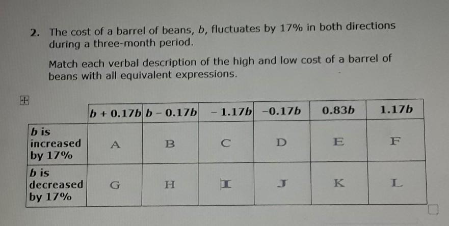 The cost of a barrel of beans, b, fluctuates by 17% in both directions during a three-month period.