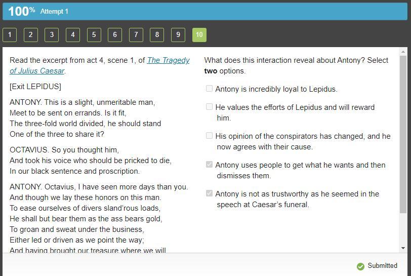 The interaction revealed that "Antony uses people to get what he wants and then dismisses them" and that "Antony is not as trustworthy as he seemed in the speech at Caesar's funeral".