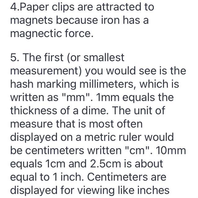 4.Paper clips are attracted to magnets because iron has a magnectic force.