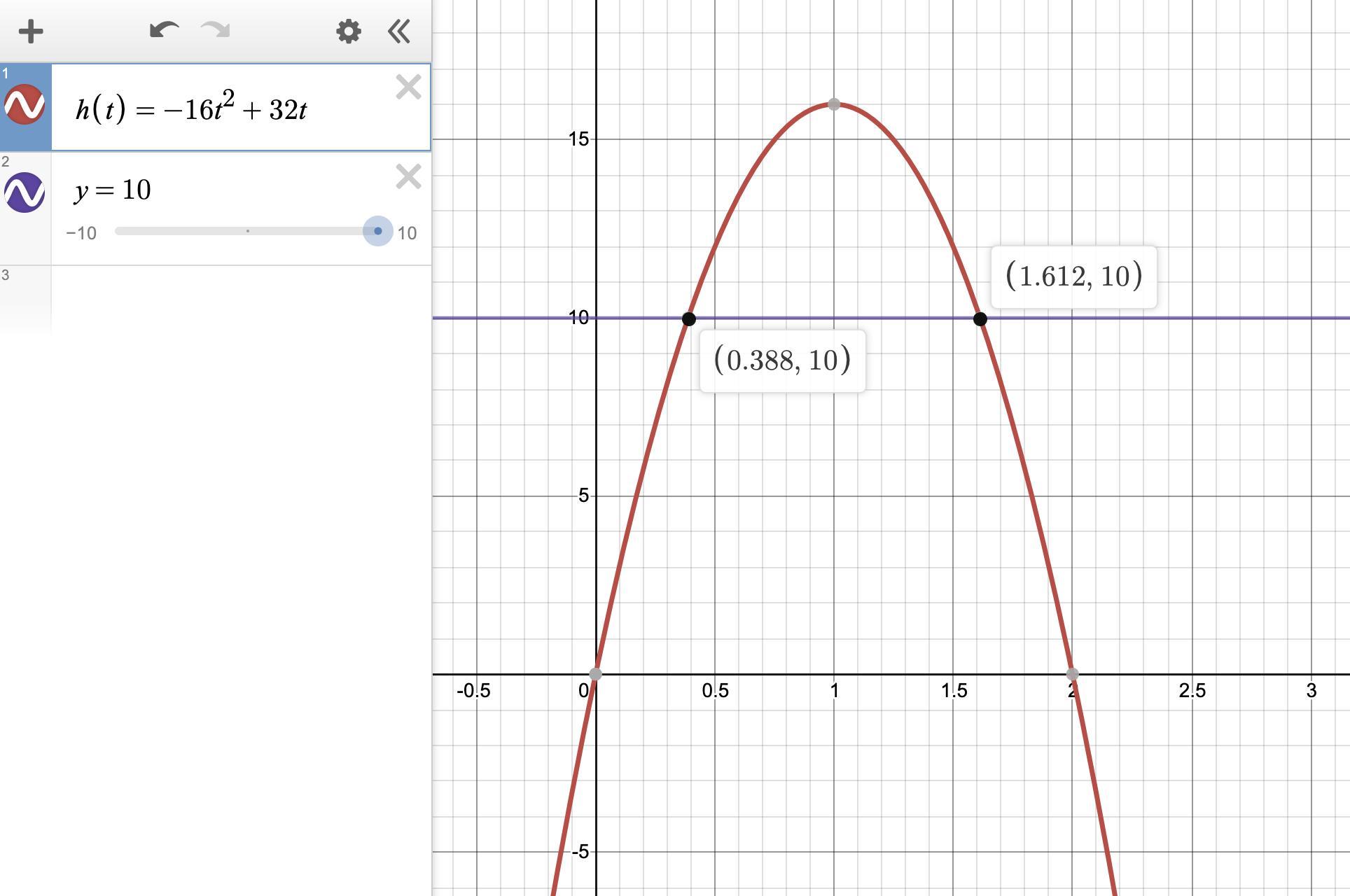 To find the time, substitute the height for h(t), then solve the quadratic equation for t.