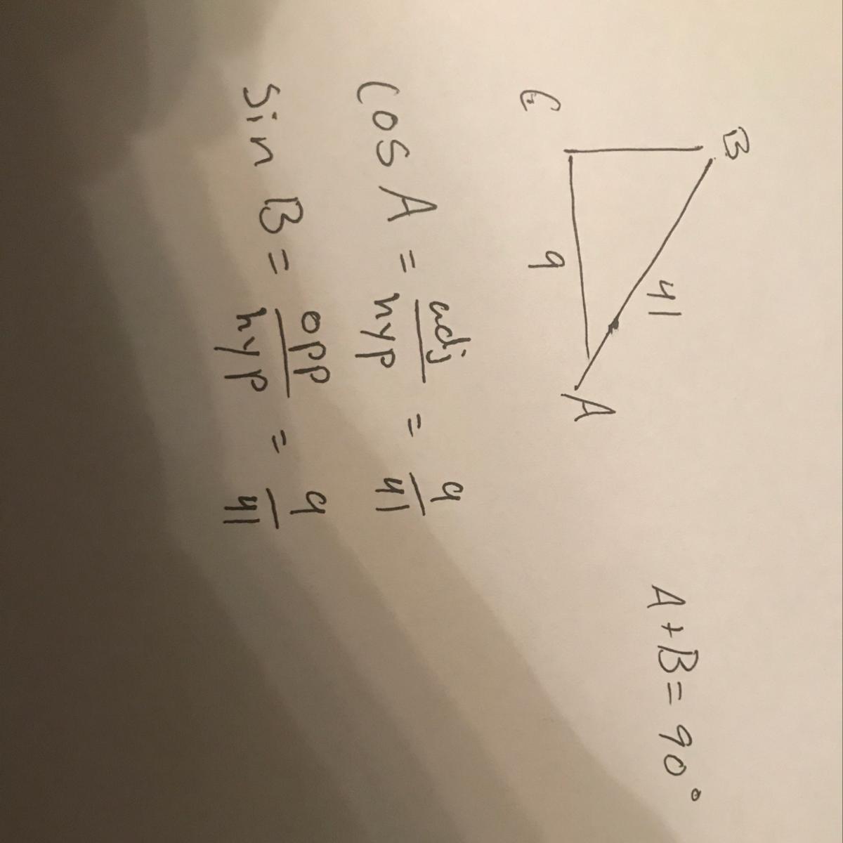 In right triangle ABC, angle A and angle B are complementary angles. The value of cos A is 9/41. What is the value of sin B?