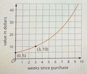 The value of a collectible toy is increasing exponentially. The two points on the graph show the toy's initial value and its value 3 weeks afterward.
