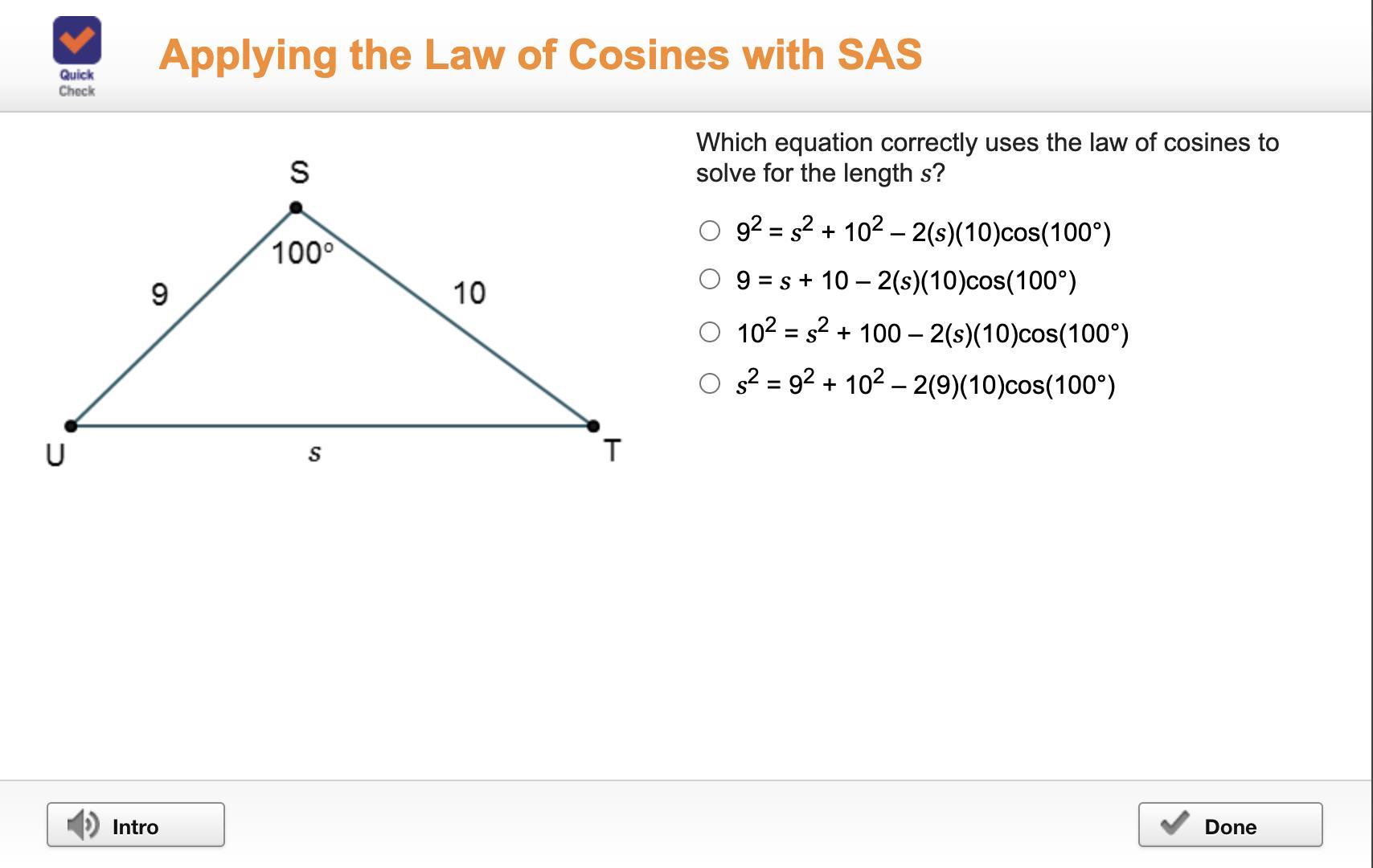 s^2 = 9^2 + 10^2 - 2(9)(10)cos(100)