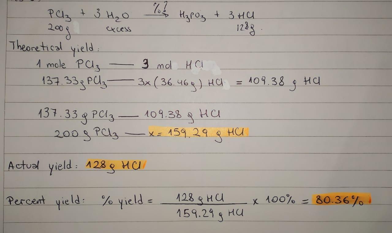 Since water is in excess, we calculate the theoretical yield using PCl₃.
