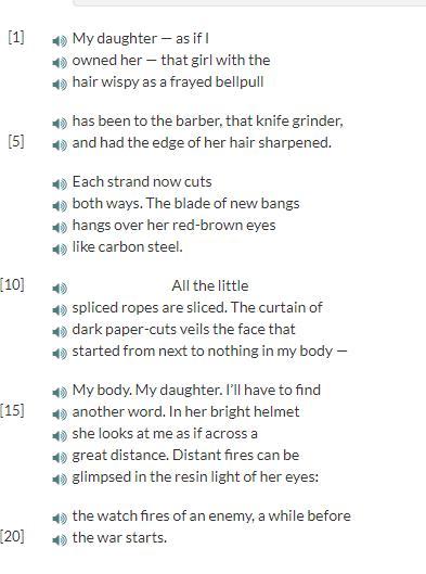 she mentions images of a war "In her bright helmet she looks at me as if across a great distance. Distant fires can be glimpsed in resin light of her eyes" she connecting her feelings with imagery of war. can you tell me if this is good or not.