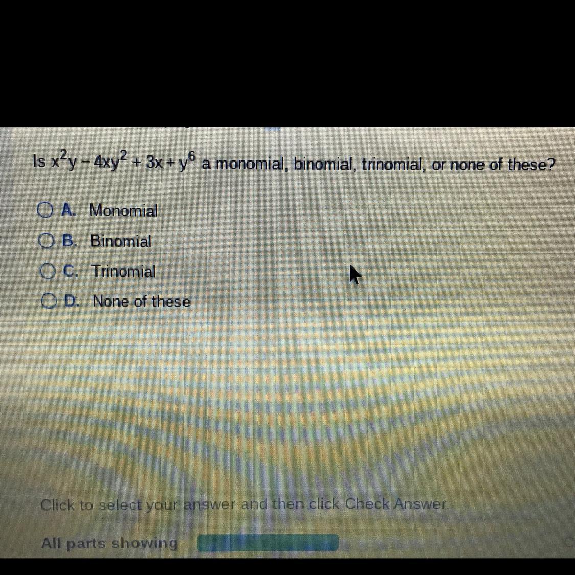 A - Monomial B - Binomial C - Trinomial D - none of the above