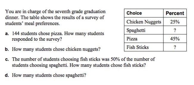 and it said tht the number of stdents choosin fish was 50% of the number of students choosing spghtti .