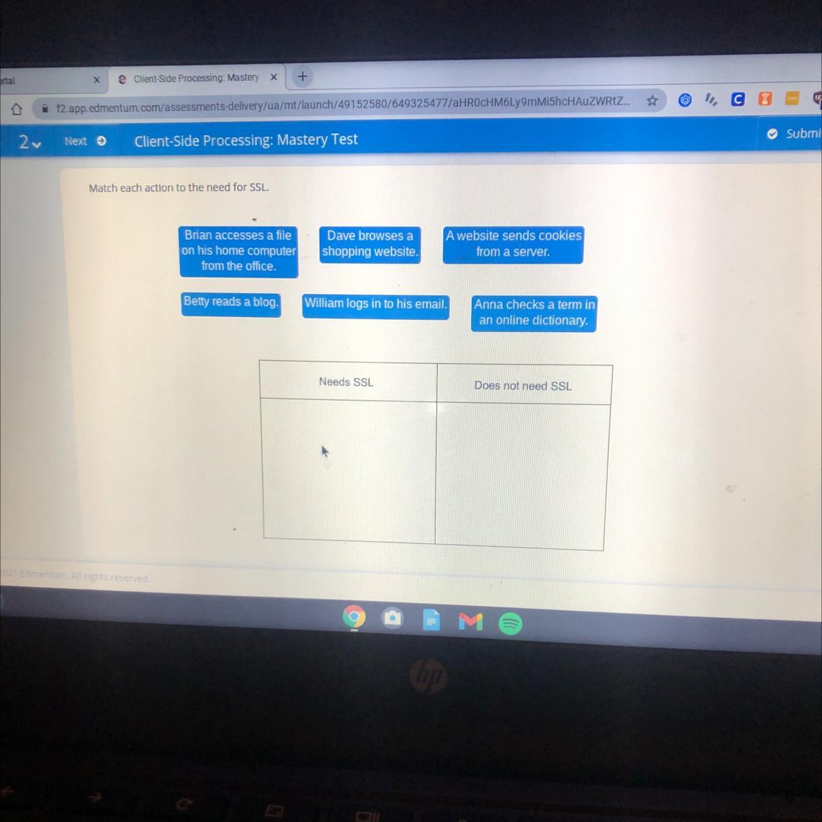 ![\begin{array}{ccc}Needs \ SSL&&Does \ not \ need \ SSL\\Brian \ accesses \ a \ file \ on \ his \ home \\ computer \from \ the \ office\\&&A \ website \ sends \ cookies \ from \ a \ server\\Dave \ browses \ a \ shopping \ website\\&&Betty \ reads \ a \ blog\\William \ logs \ in \ to \ his \ email&&Anna \ checks \ a \ term \ in \ an \ online \ dictionary\end{array}\right]](https://tex.z-dn.net/?f=%5Cbegin%7Barray%7D%7Bccc%7DNeeds%20%5C%20SSL%26%26Does%20%5C%20not%20%5C%20need%20%5C%20SSL%5C%5CBrian%20%5C%20accesses%20%5C%20a%20%5C%20file%20%5C%20on%20%5C%20his%20%5C%20home%20%5C%5C%20computer%20%5Cfrom%20%5C%20the%20%5C%20office%5C%5C%26%26A%20%5C%20website%20%5C%20sends%20%5C%20cookies%20%20%5C%20from%20%5C%20a%20%5C%20server%5C%5CDave%20%5C%20browses%20%5C%20a%20%5C%20shopping%20%5C%20website%5C%5C%26%26Betty%20%5C%20reads%20%5C%20a%20%5C%20blog%5C%5CWilliam%20%5C%20logs%20%5C%20in%20%5C%20to%20%5C%20his%20%5C%20email%26%26Anna%20%5C%20checks%20%5C%20a%20%5C%20term%20%5C%20in%20%5C%20an%20%5C%20online%20%5C%20dictionary%5Cend%7Barray%7D%5Cright%5D)