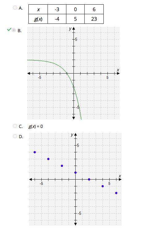 This leaves us with the graph that displays a exponential line. We can however, see that there's a point that does match with this equation. That point is (0,-2). Considering this graph is showing an exponential line, one of the points for our function 'g(0) = -2' would be (0,-2).