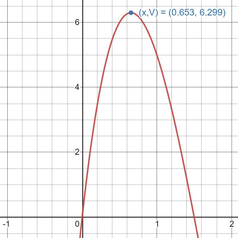 b) A side length of 0.653 inches leads to the maximum volume of the box: 6.299 inches.