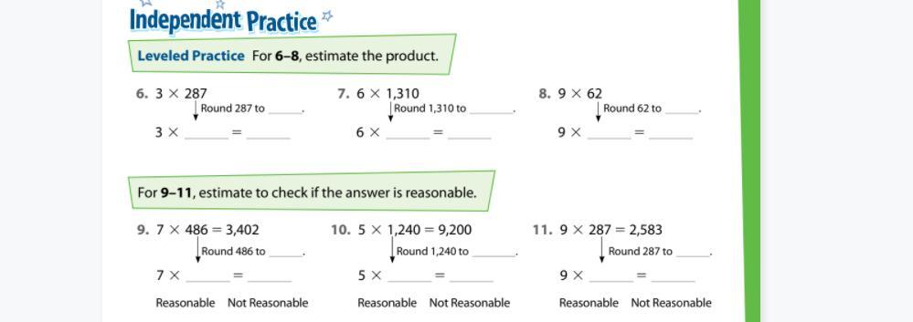 10. round 1,240 to the nearest 100 which will be 1,200 so then 1,200 times 5 equals 6,000 then mark unreasonable