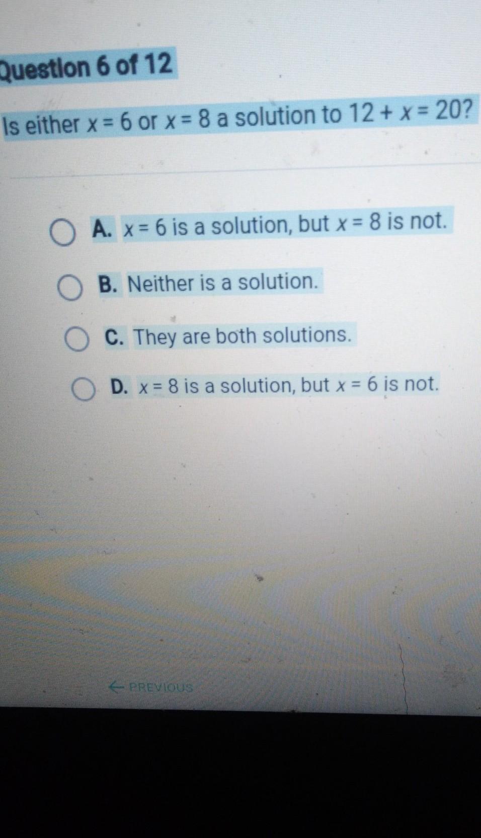 It's d because 12 + 8=20 while 12 + 6=18
