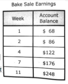 y for activities during the school year, the club has bake sales every Friday after school. The table shows the club’s balance after the bake sale. Write an equation to represent the Spanish Club’s account balance after x weeks." is the question