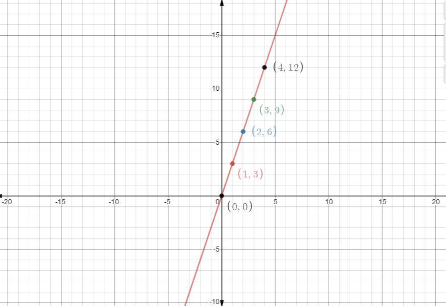 now substituting m = 3 and b = 0 in the slope-intercept form of the line equation
