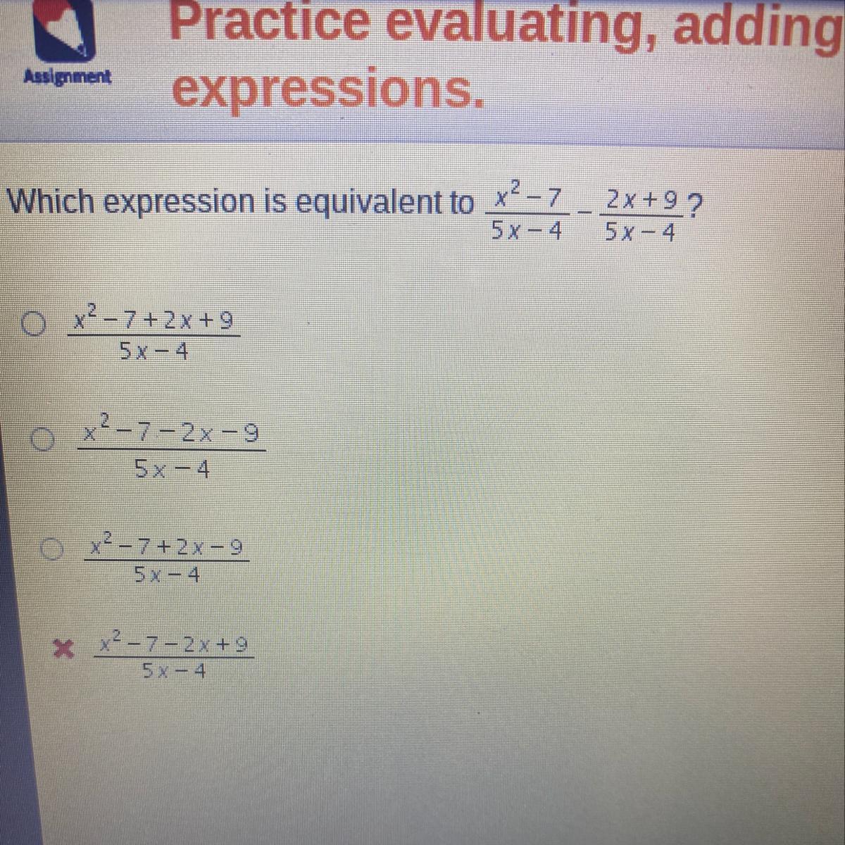 Which expression is equivalent to x^2-7/5x-4 - 2x+9/5x-4?