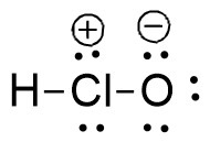 An image is attached depicting the Lewis structure of HClO with the atoms arranged in that order. The result is a single bond between each atom. We can calculate the formal charge of each atom with the following formula: