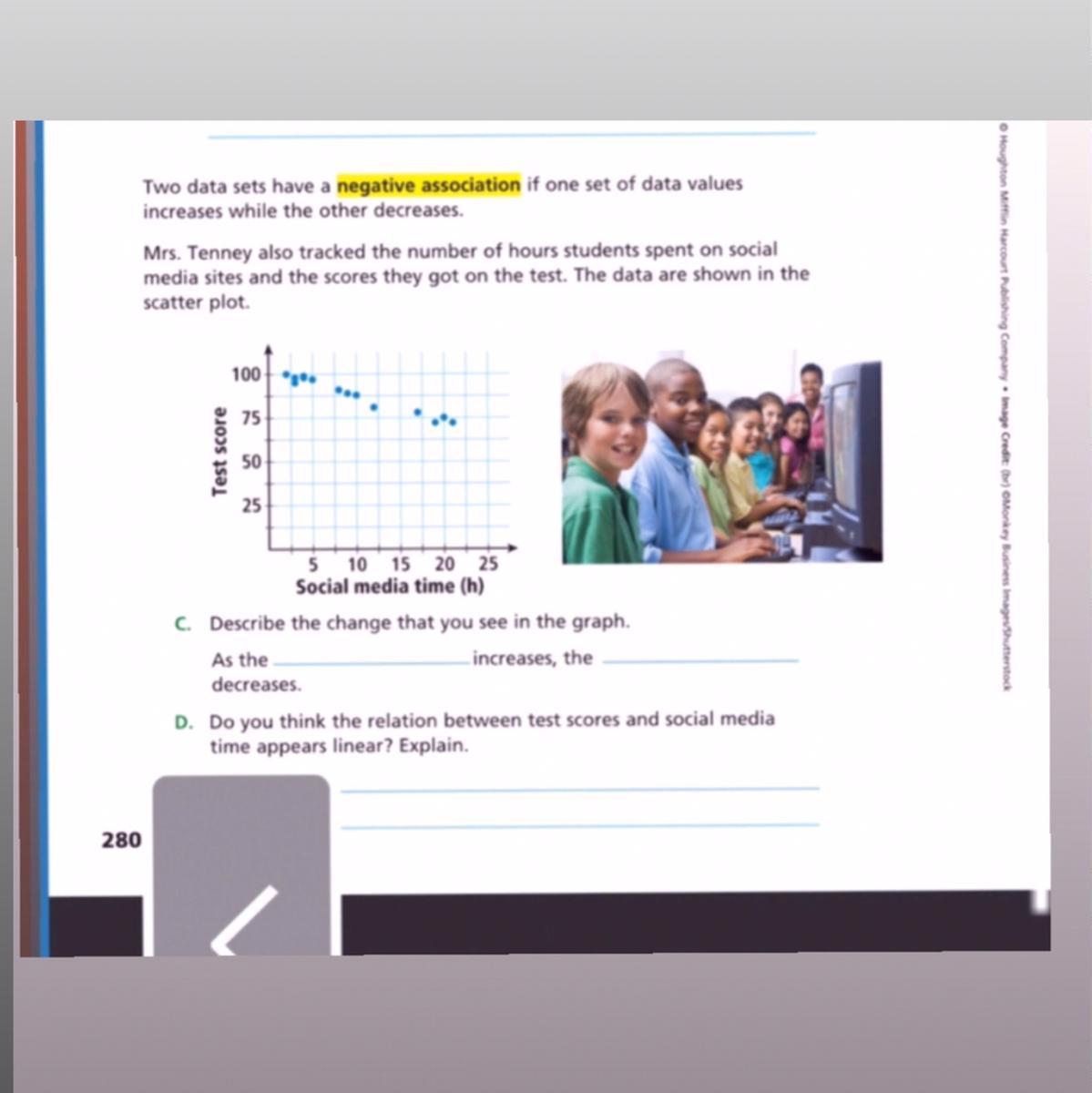 D. Yes, I think the relationship between the test scores and social media time appears liner, because linear lines tend to be straight, and has a constant rate of change. In this case, there is a constant rate of change, and the plot points aren't all over the place.