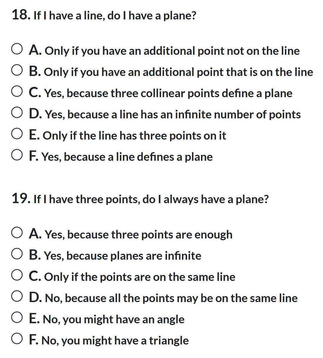18) You can only have a plane if there is an additional point not on the line.
