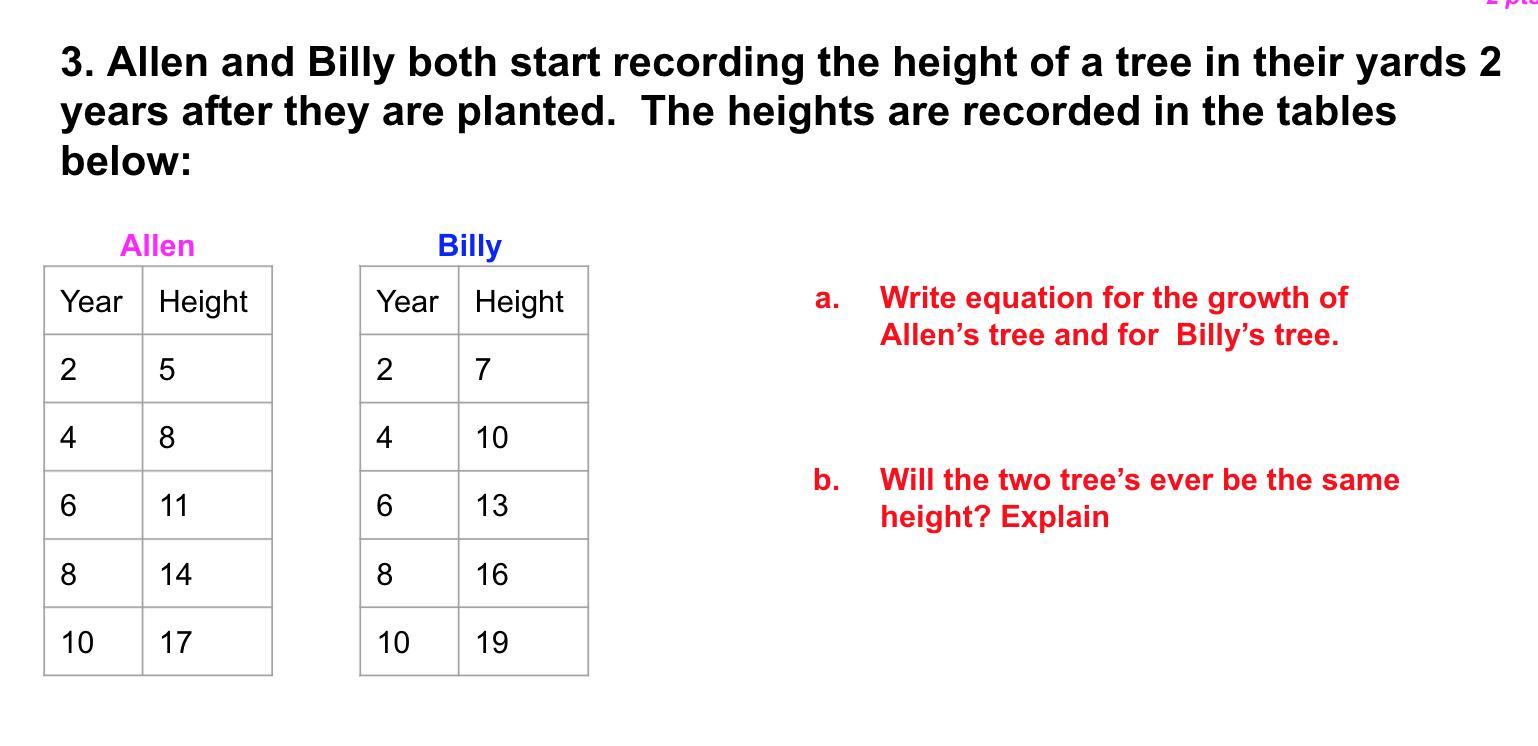 as for the second question, the lines are parallel. they have the exact same slope so that means that they will never cross because billy's line is higher then allens, billy's tree will always be higher