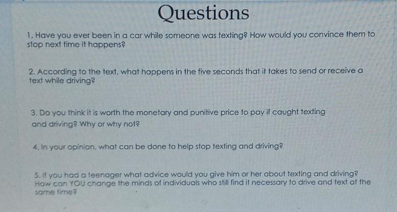 5) To a teenager, the advice I would give is the same things I put for question 3. I think that these steps applies not just for teenagers but for everyone who can drive, no matter the age. Now, to the individuals who think that it’s necessary to drive and text at the same time, what I would say to them is “threaten them” not in a bad way, but what I would say is “There has been a lot of cops around here, you should put your phone away or else you can get a ticket”. It will scare them because who wants to pay a ticket? No one right? If the person is stubborn because sometimes people think they are right and refuse to be in the wrong, just don’t ride with them. Why put yourself at risk? If they get hurt or get something hurt, it’s their fault. Just remember to never go on your phone while driving. Not only are you putting yourself at risk being hurt or even killed but putting everyone and everything else at risk by getting hurt or killed.