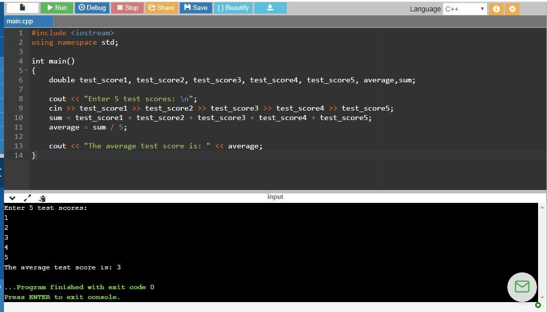 double test_score1, test_score2, test_score3, test_score4, test_score5, average, sum;