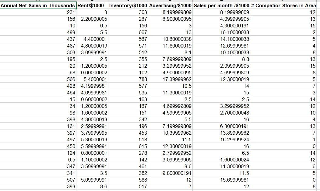 b₀: -49.17 thousand dollars represents the estimated average annual net sales when the monthly rent, the inventory expenses, the advertising expenses, the monthly sales and the number of competitors in the area are zero.