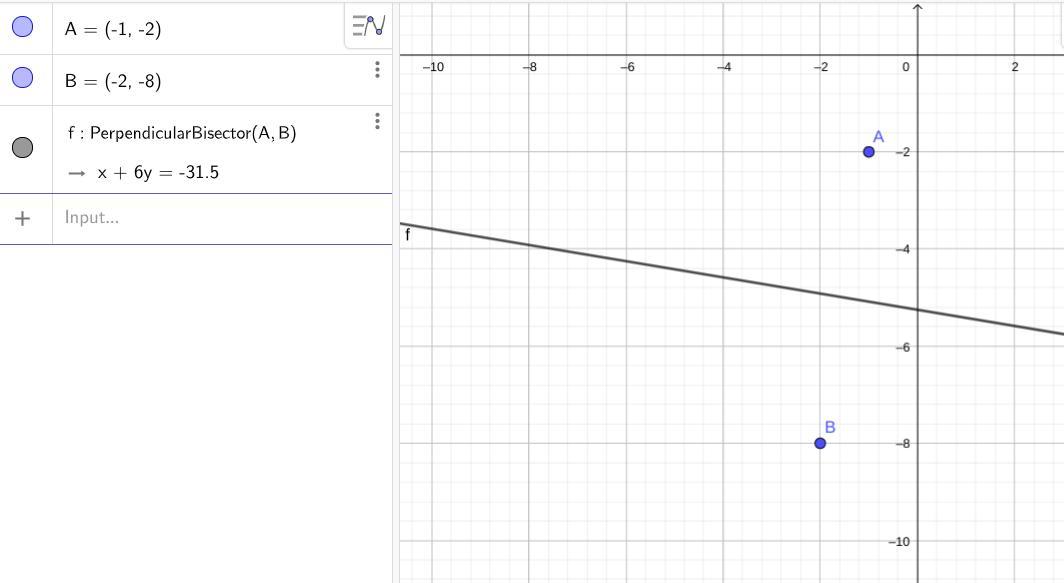 M = ((-1, -2) +(-2, -8))/2 = ((-1-2)/2, (-2-8)/2) = (-3/2, -5)