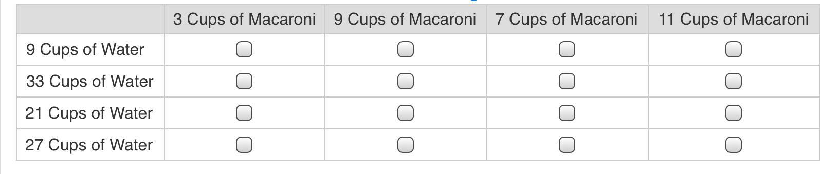 Therefore, 1 cup of macaroni will require 27/9 = 3 cups of water